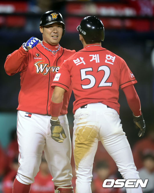 16일 오후 서울 잠실야구장에서 '2014 한국야쿠르트 세븐 프로야구' 두산 베어스와 SK 와이번스의 경기가 열렸다. 연장 10회초 무사 2,3루 SK 이재원이 조동화의 우익수 희생플라이때 득점을 올린 박계현과 기뻐하고 있다. 4강 진출 좌절 위기인 SK 와이번스가 최후의 보루를 꺼내들었다. SK가 포스트시즌에 진출하기 위해서는 남은 2경기에서 모두 승리해야만 하고, LG가 남은 1경기에서 패해야만 한다. 양 팀 중 한 팀이라도 무승부가 발생하면 4위는 LG가 차지한다. 그야말로 벼랑 끝에 선 SK는 에이스 김광현을 내세웠다. 김광현은 아시안게임 대표팀에서 복귀한 뒤 2경기에서 썩 좋지만은 않았다. 11이닝 동안 4실점(3자책)으로 대량 실점은 피했지만, 볼넷이 10개나 될 정도로 투구 내용은 만족스럽지 못했다. 그래도 가장 어려운 순간에도 고민하지 않고 내보낼 수 있는 투수라는 점에는 변함이 없다. 김광현에 맞서는 두산 선발은 이현승이다. 이현승도 올해 선발로 나선 최근 2경기 성적이 들쭉날쭉하다. 지난 5일 마산 NC전에서는 5이닝 2실점으로 호투했지만, 4일 휴식 후 치른 10일 대전 한화전에서는 1⅓이닝 2실점하고 조기 강판됐다. / youngrae@osen.co.kr