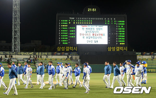 경기 종료 후 삼성 선수들이 관중석을 향해 인사를 하고 경기장을 나가고 있다. /sunday@osen.co.kr