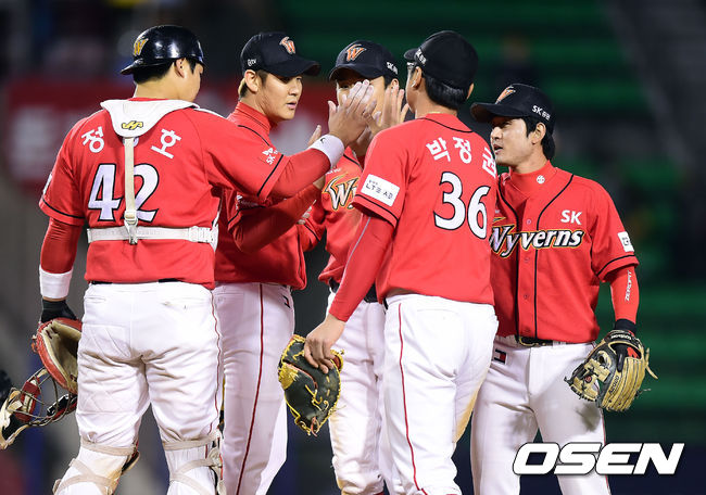 SK 와이번스가 두산 베어스를 상대로 대역전극을 쓰며 4위 싸움을 최후의 순간까지 끌고 갔다. SK는 16일 잠실구장에서 열린 2014 한국야쿠르트 세븐 프로야구 두산와의 경기에서 0-5로 뒤졌지만 포기하지 않고 끝내 역전에 성공하며 7-5로 승리했다. 61승 2무 64패가 된 5위 SK는 4위 LG와의 포스트시즌 막차 티켓 경쟁을 정규시즌 최종일인 17일까지 이어지게 만들었다. 승리를 거둔 SK 선수들이 기뻐하고 있다. / youngrae@osen.co.kr