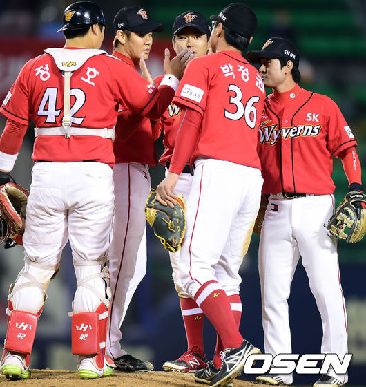 SK 와이번스가 두산 베어스를 상대로 대역전극을 쓰며 4위 싸움을 최후의 순간까지 끌고 갔다. SK는 16일 잠실구장에서 열린 2014 한국야쿠르트 세븐 프로야구 두산와의 경기에서 0-5로 뒤졌지만 포기하지 않고 끝내 역전에 성공하며 7-5로 승리했다. 61승 2무 64패가 된 5위 SK는 4위 LG와의 포스트시즌 막차 티켓 경쟁을 정규시즌 최종일인 17일까지 이어지게 만들었다. 승리를 거둔 SK 선수들이 기뻐하고 있다. / youngrae@osen.co.kr