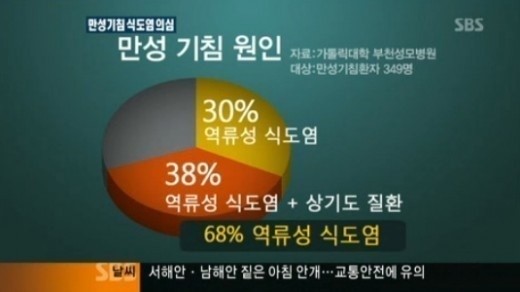 한 대학병원이 중장년층 만성 기침의 원인을 조사한 결과, 30%는 기관지 질환 없이 역류성 식도염만 있었고, 38%는 상기도 질환과 역류성 식도염이 함께 발견됐다. 만성기침 환자의 68%가 역류성 식도염을 함께 갖고 있는 셈이다.