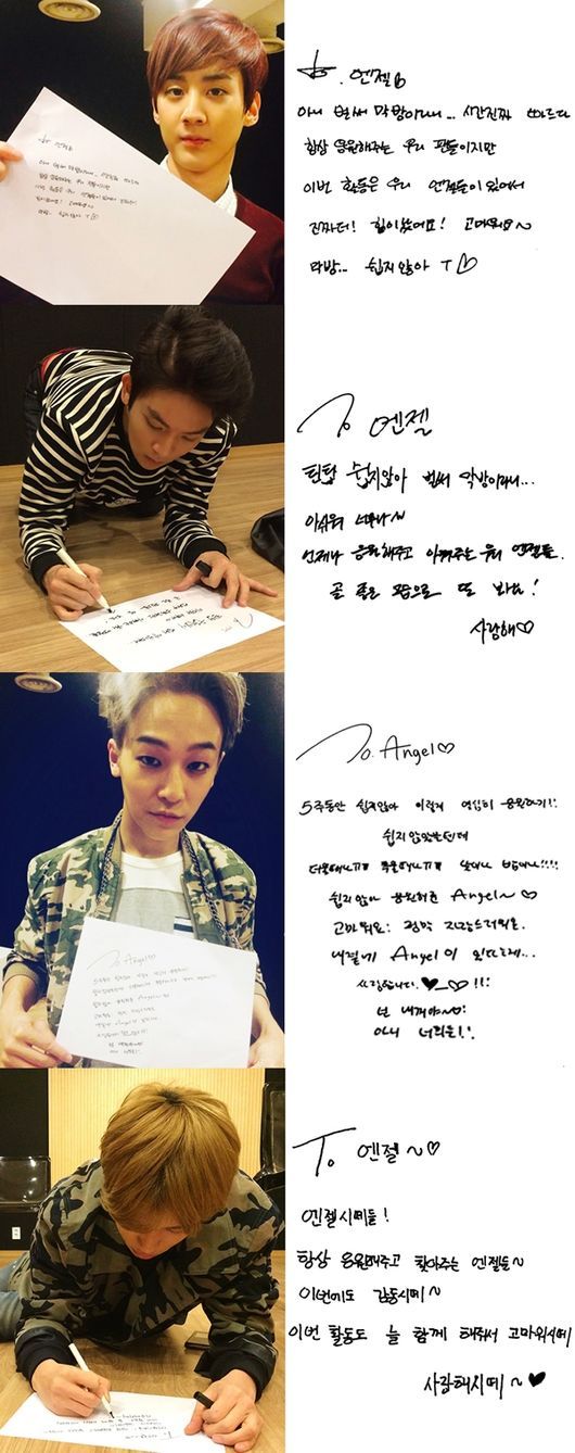 공개된 사진 속 틴탑은 정성스레 손글씨를 쓰는 모습과 함께 팬들에게 보내는 메시지를 공개해 훈훈함을 선사했다. 특히 틴탑의 엘조는 “쉽지않아 이렇게 열심히 응원하기 쉽지 않았을 텐데 더울 때나 추울 때나 낮이나 밤이나! 쉽지않아 응원해준 엔젤 고마워요! 정말 자랑스러워요! 내 곁에 엔젤이 있다는게…사랑합니다! 넌 내 꺼야! 아니 너희들!” 이라고 전했다.