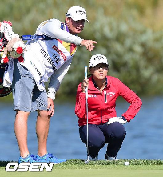 17일 오전 인천 영종도에 위치한 스카이72 골프클럽에서 열린 'LPGA 하나·외환 챔피언십'에서 리디아 고가 퍼팅 라인을 살피고 있다.