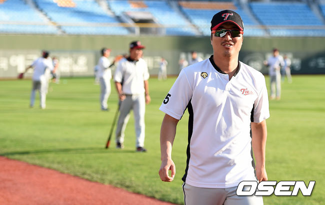17일 오후 부산 사직야구장에서 진행될 '2014 한국야쿠르트 세븐 프로야구' 롯데 자이언츠와 LG 트윈스의 경기에 앞서 LG 이진영이 훈련을 마치고 더그아웃으로 가고 있다.