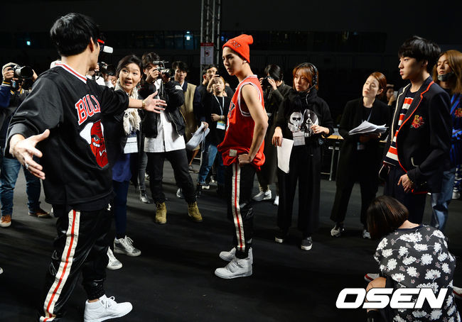 17일 오후 서울 동대문 디자인 플라자에서 열린 '2015 S/S 서울패션위크' 고태용 비욘드 클로젯(beyond closet) 리허설에서 고태용 디자이너가 위너멤버 송민호 강승윤과 동선체크를 하고 있다.