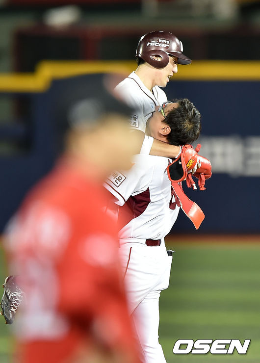 17일 오후 서울 잠실야구장에서 열린 '2014 한국야쿠르트 세븐 프로야구' 넥센 히어로즈와 SK 와이번스의 경기, 1회말 선두타자 넥센 서건창이 역대 최초 200안타에 성공하고 있다. 2루에서 심재학 코치가 서건창을 들어올리고 있다.