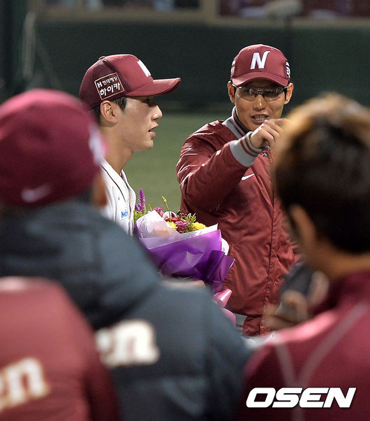 17일 오후 서울 잠실야구장에서 열린 '2014 한국야쿠르트 세븐 프로야구' 넥센 히어로즈와 SK 와이번스의 경기,1회를 마친 후 역대 최초 200안타를 날린 서건창이 염경엽 감독에게 꽃다발을 받고 있다.
