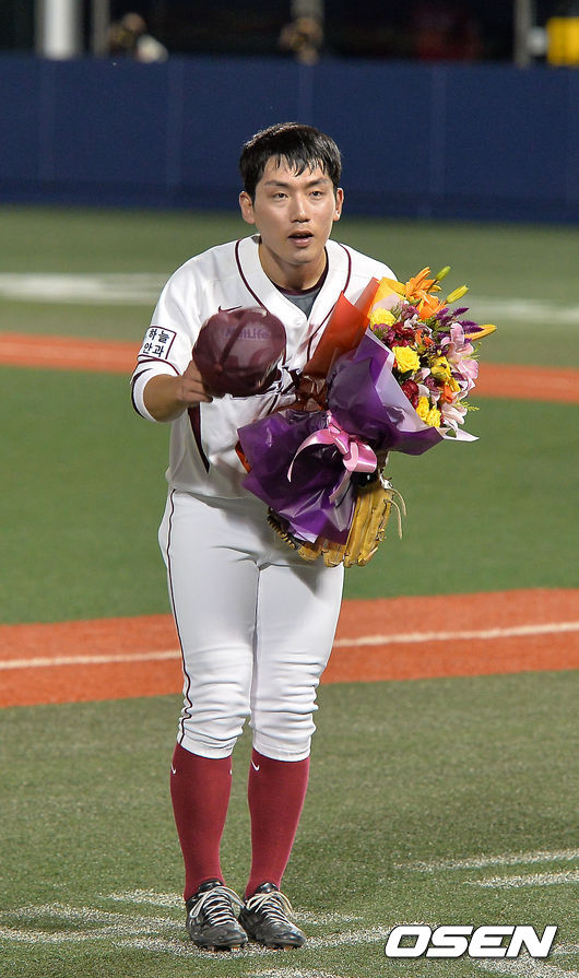17일 오후 서울 잠실야구장에서 열린 '2014 한국야쿠르트 세븐 프로야구' 넥센 히어로즈와 SK 와이번스의 경기,1회를 마친 후 역대 최초 200안타를 날린 서건창이 염경엽 감독에게 꽃다발을 받고 팬들에게 인사를 하고 있다.