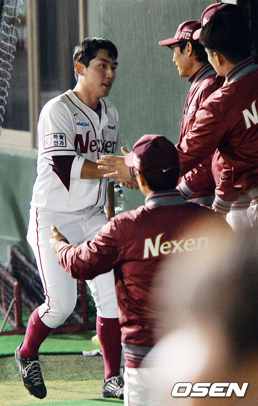 17일 오후 서울 잠실야구장에서 열린 '2014 한국야쿠르트 세븐 프로야구' 넥센 히어로즈와 SK 와이번스의 경기,1회말 1사 주자 3루 넥센 유한준의 우익수 앞 1타점 적시타때 홈을 밟은 서건창이 염경엽 감독의 축하를 받고 있다. 서건창은 1회 선두타자로 나서 채병룡을 상대로 우익선상 2루타를 뽑아내며 꿈의 200안타를 달성했다.