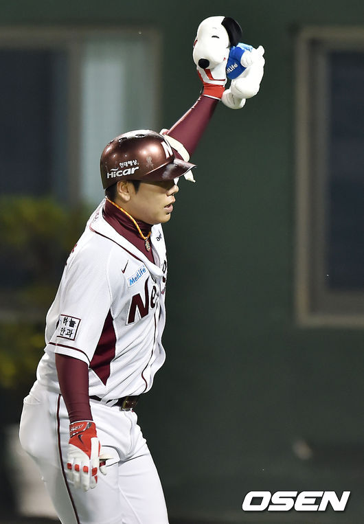 17일 오후 서울 잠실야구장에서 열린 '2014 한국야쿠르트 세븐 프로야구' 넥센 히어로즈와 SK 와이번스의 경기,넥센 강정호가 1회 2사 1루에서 채병룡을 상대로 2점 홈런을 쏘아올린 후 홈을 밟으며 팬들에게 인사를 하고 있다.