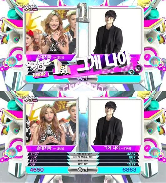 김동률은 17일 오후 6시 30분 방송된 KBS 2TV '뮤직뱅크'에서 곡 '그게 나야'로 에일리의 '손대지마'를 꺾고 1위 트로피를 거머쥐었다.