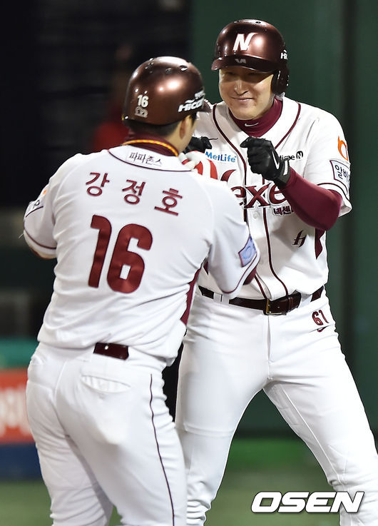 17일 오후 서울 잠실야구장에서 열린 '2014 한국야쿠르트 세븐 프로야구' 넥센 히어로즈와 SK 와이번스의 경기,넥센 강정호가 1회 2사 1루에서 채병룡을 상대로 2점 홈런을 쏘아올린 후 홈에서 유한준과 하이파이브를 하고 있다.