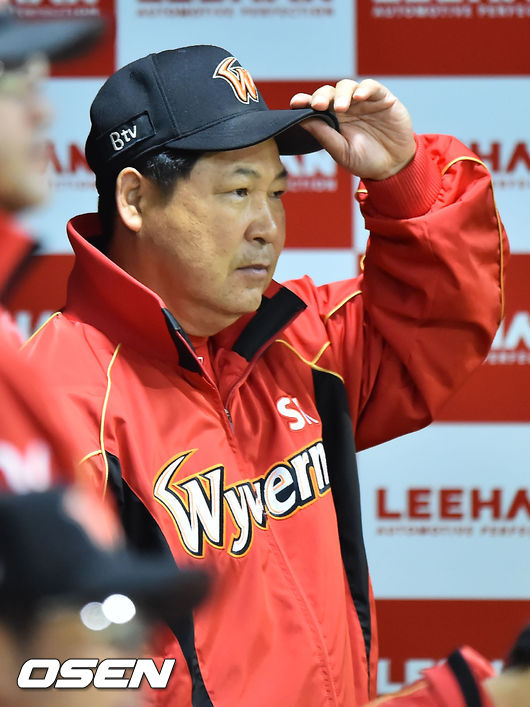 17일 오후 서울 잠실야구장에서 열린 '2014 한국야쿠르트 세븐 프로야구' 넥센 히어로즈와 SK 와이번스의 경기, SK 이만수 감독이 경기를 긴장한 표정으로 지켜보고 있다.