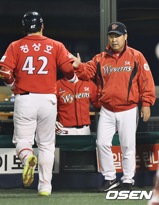 17일 오후 서울 목동야구장에서 열린 '2014 한국야쿠르트 세븐 프로야구' 넥센 히어로즈와 SK 와이번스의 경기, 7회초 SK 선두타자 정상호가 중월 솔로 홈런을 날린 후 덕아웃에서 이만수 감독과 하이파이브를 하고 있다.