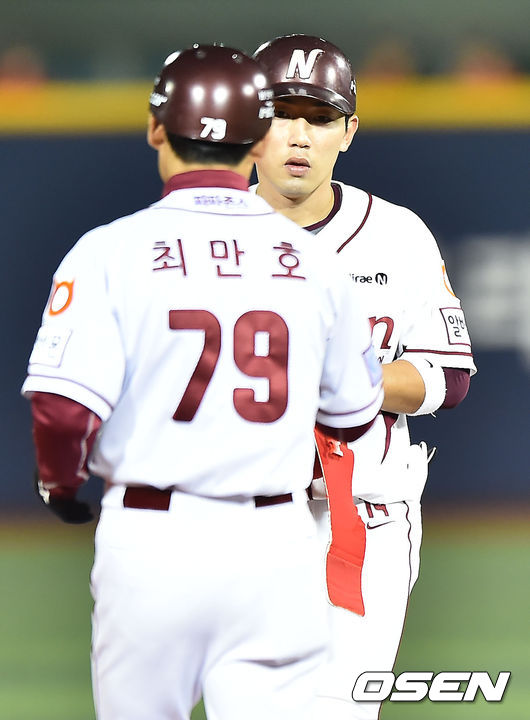 17일 오후 서울 목동야구장에서 열린 '2014 한국야쿠르트 세븐 프로야구' 넥센 히어로즈와 SK 와이번스의 경기, 8회말 2사 주자 없는 상황에서 넥센 서건창이 시즌 201안타를 날린 후 2루에서 최만호 코치와 하이파이브를 하고 있다.