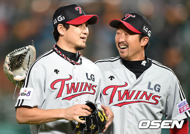8회초 공수교대때 LG의 4강 합류가 확정되자 신재웅과 이병규가 미소를 지으며 더그아웃으로 가고 있다.
