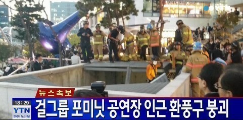 소방당국은 17일 오후 5시쯤 경기도 성남시 판교신도시 유스페이스 야외광장에서 열린 판교 테크노밸리 축하공연 도중 환풍구 위에서 관람을 하던 20명이 20m아래로 떨어졌다고 밝혔다. 당시 인기걸그룹의 공연을 지켜보던 관람객들은 환풍구가 무너지면서 아래로 떨어졌다. 판교 사고로 공연은 중단됐다.