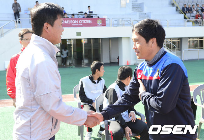 18일 오후 대전 한밭종합운동장에서 열린 '2014 현대오일뱅크 K리그 챌린지 32라운드' 대전 시티즌과 FC안양의 경기, 양팀 감독이 악수를 나누고 있다.