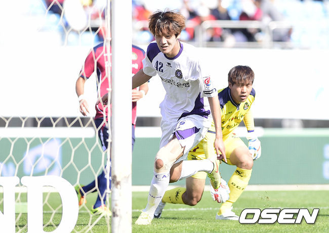 18일 오후 대전 한밭종합운동장에서 열린 '2014 현대오일뱅크 K리그 챌린지 32라운드' 대전 시티즌과 FC안양의 경기, 안양 정재용이 선제골을 넣고 세리머니를 하고 있다.