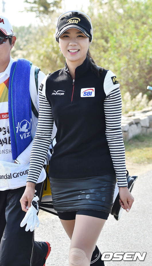 18일 오전 인천 영종도에 위치한 스카이72 골프클럽에서 열린 'LPGA 하나·외환 챔피언십'에서 허윤경 취재진을 바라보며 미소짓고 있다.