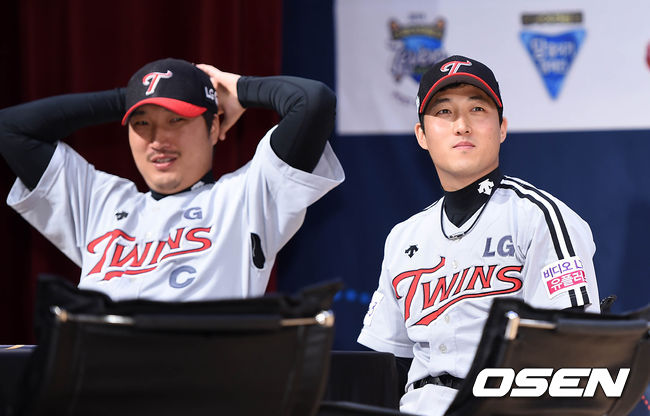 공식 행사에 앞서 LG 이진영과 신정락이 자리에 앉아 행사를 기다리고 있다.