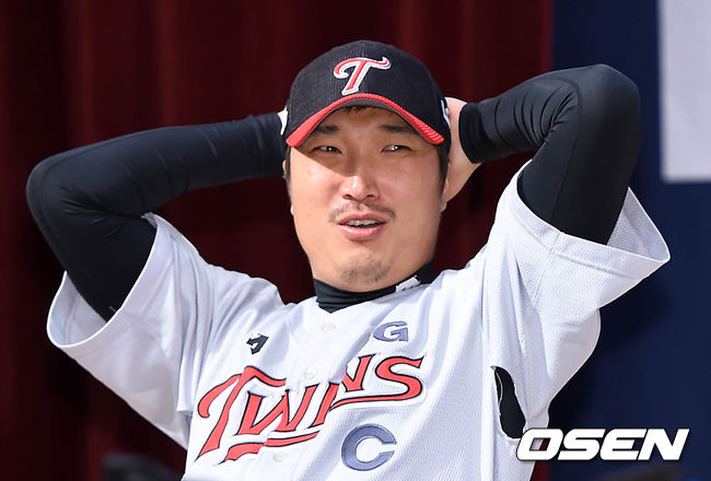 공식 행사에 앞서 LG 이진영이 자리에 앉아 행사를 기다리고 있다.
