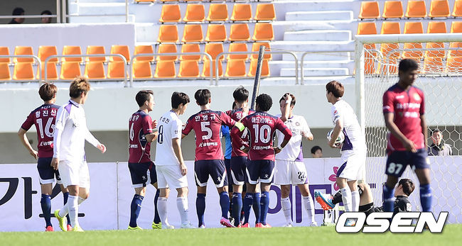 18일 오후 대전 한밭종합운동장에서 열린 '2014 현대오일뱅크 K리그 챌린지 32라운드' 대전 시티즌과 FC안양의 경기, 전반전 대전 임창우의 골이 파울로 선언되자 선수들이 항의하고 있다.