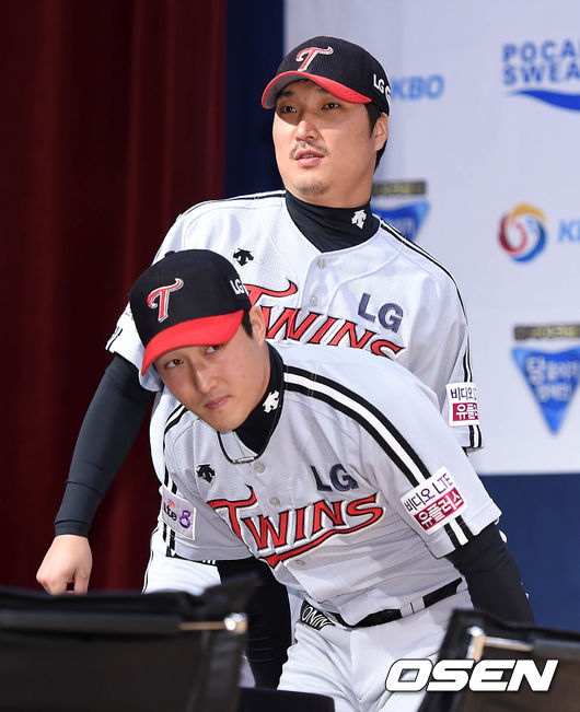 공식 행사에 앞서 LG 이진영과 신정락이 자리에 앉아 행사를 기다리고 있다.