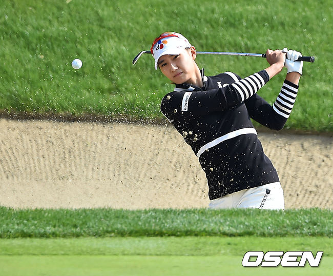 18일 오전 인천 영종도에 위치한 스카이72 골프클럽에서 열린 'LPGA 하나·외환 챔피언십'에서 김민선이 벙커샷을 시도하고 있다.