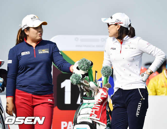 18일 오전 인천 영종도에 위치한 스카이72 골프클럽에서 열린 'LPGA 하나·외환 챔피언십'에서 박인비와 유소연이 즐겁게 얘기를 나누고 있다.
