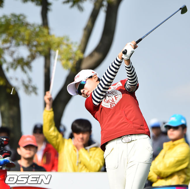 18일 오전 인천 영종도에 위치한 스카이72 골프클럽에서 열린 'LPGA 하나·외환 챔피언십'에서 김효주가 티샷을 날리고 있다.