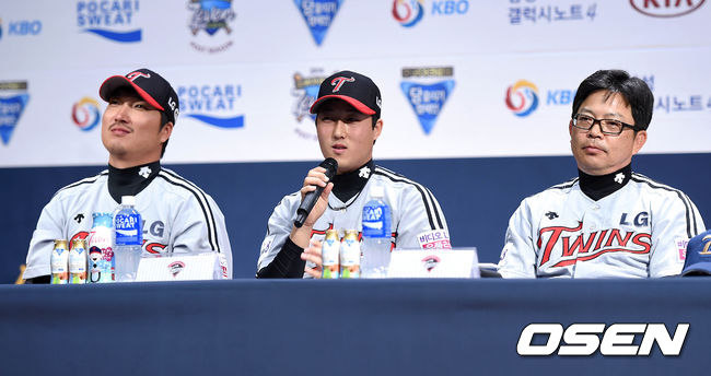 LG 이진영, 신정락, 양상문 감독이 취재진의 질문을 듣고 있다.