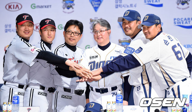 LG 이진영, 신정락, 양상문 감독과 NC 김경문 감독, 이호준, 손민한이 준플레이오프 포즈를 취하고 있다,