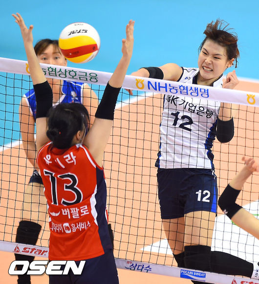 18일 오후 대전 충무체육관에서 열린 2014~2015 NH농협 V리그 여자부 KGC인삼공사와 IBK기업은행의 경기, 1세트 IBK 채선아가 강타를 날리고 있다.