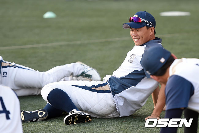 NC 이종욱이 훈련을 하며 미소를 짓고 있다.