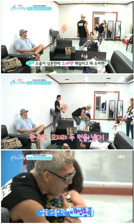 박준형과 데니안, 손호영는 소율이와 지율이를 반겼다. 데니안은 박준형에게 소율이에게 높이 들었다가 내리는 '슈퍼맨 놀이'를 해줄 것을 제안했다. 박준형은 두 차례 소율이를 들었다 내려줬고, 다소 과격했던 탓에 소율이는 끝내 눈물을 흘리고 말았다.