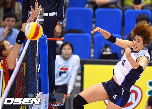 18일 오후 대전 충무체육관에서 열린 2014~2015 NH농협 V리그 여자부 KGC인삼공사와 IBK기업은행의 경기, 3세트 IBK 김희진이 강타를 날리고 있다