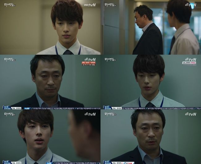 18일 오후 방송된 tvN 금토드라마 '미생'에서는 엘리베이터 안에서 대립하는 장그래(임시완 분)와 오과장(이성민 분)의 모습이 전파를 탔다.