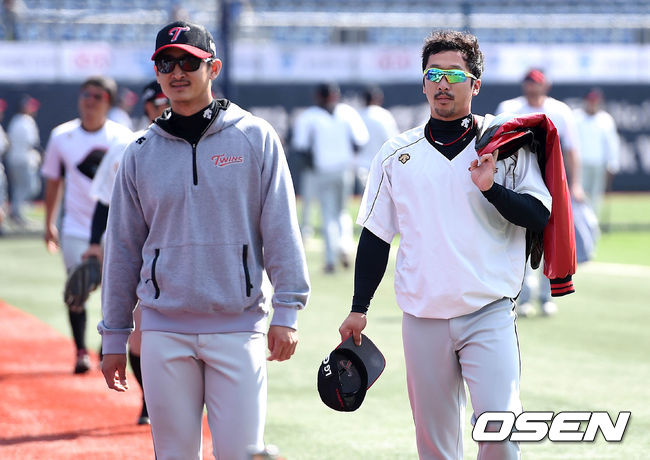 19일 오후 경남 창원 마산야구장에서 진행될 2014 한국야쿠르트 세븐 프로야구 준플레이오프 1차전 NC 다이노스와 LG 트윈스의 경기에 앞서 LG 박용택과 이병규가 더그아웃으로 가고 있다.