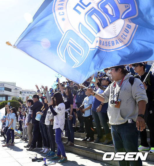 19일 오후 경남 창원 마산야구장에서 진행될 2014 한국야쿠르트 세븐 프로야구 준플레이오프 1차전 NC 다이노스와 LG 트윈스의 경기에 앞서 NC 팬들이 응원가를 부르며 환호하고 있다.