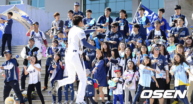 19일 오후 경남 창원 마산야구장에서 2014 한국야쿠르트 세븐 프로야구 포스트시즌 준플레이오프 NC 다이노스와 LG 트윈스의 경기, 경기시작전 NC 팬들이 장외응원을 펼치고 있다.