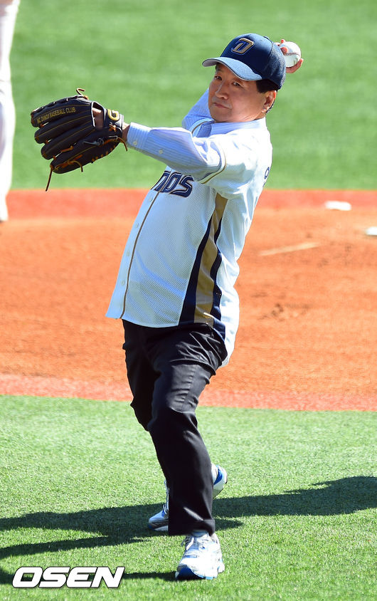 19일 오후 경남 창원 마산야구장에서 2014 한국야쿠르트 세븐 프로야구 포스트시즌 준플레이오프 NC 다이노스와 LG 트윈스의 경기전 안상수 창원시장이 시구를 하고 있다.