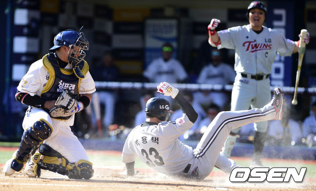 19일 오후 경남 창원 마산야구장에서 2014 한국야쿠르트 세븐 프로야구 포스트시즌 준플레이오프 NC 다이노스와 LG 트윈스의 경기, 1회초 1사 주자 1,2루 LG 이병규의 안타에 1루 주자 박용택이 슬라이딩으로 홈에서 세이프되고 있다.