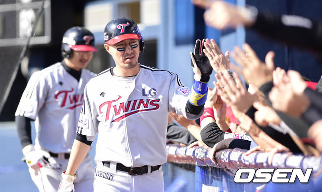 19일 오후 경남 창원 마산야구장에서 2014 한국야쿠르트 세븐 프로야구 포스트시즌 준플레이오프 NC 다이노스와 LG 트윈스의 경기, 1회초 1사 주자 1,2루 LG 이병규의 2타점 2루타에 홈을 밟은 정성훈과 박용택이 동료들과 기쁨을 나누고 있다.