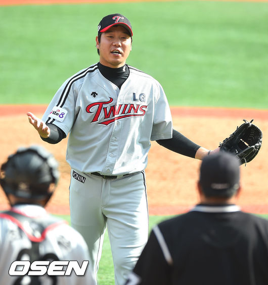 19일 오후 경남 창원 마산야구장에서 열린 2014 한국야쿠르트 세븐 프로야구 포스트시즌 준플레이오프 NC 다이노스와 LG 트윈스의 경기,2회말 2사 NC 손시헌 타석 타임과 동시에 던진 공이 구심에게 향하자 류제국이 최수원 구심에게 고의가 아니라는 제스쳐를 취하고 있다.