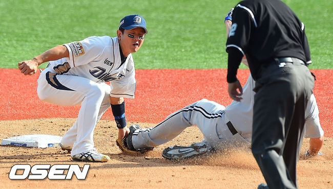 19일 오후 경남 창원 마산야구장에서 열린 2014 한국야쿠르트 세븐 프로야구 포스트시즌 준플레이오프 NC 다이노스와 LG 트윈스의 경기,3회초 2사 1루 LG 김용의 타석때 1루 주자 스나이더가 도루성공하고 있다.