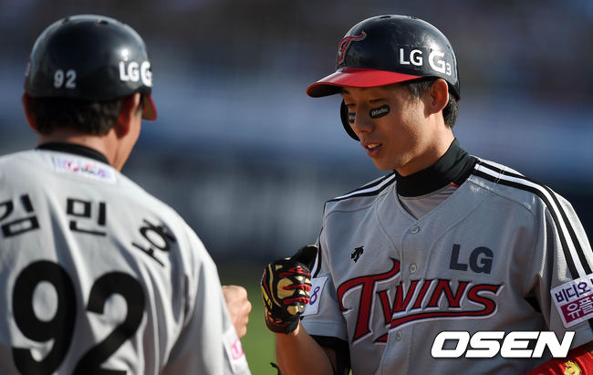 3회초 2사 3루에서 LG 김용의가 적시타를 치고 김민호 코치와 하이파이브를 하고 있다.