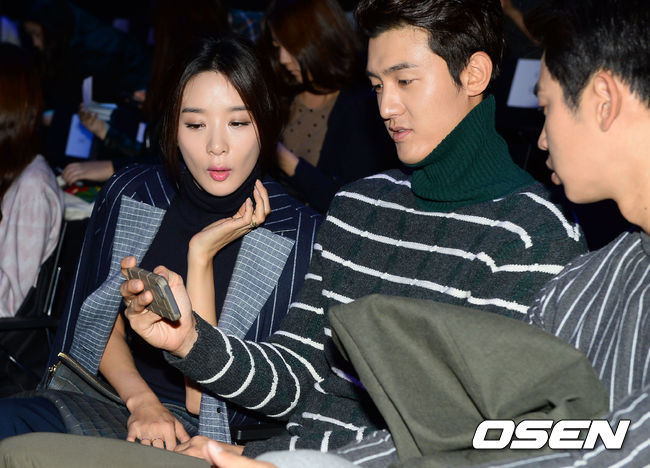 19일 오후 서울 동대문 디자인 플라자에서 열린 '2015 S/S 서울패션위크' 홍혜진 컬렉션을 찾은 이청아가 이기우 핸드폰을 보며 미소짓고 있다.