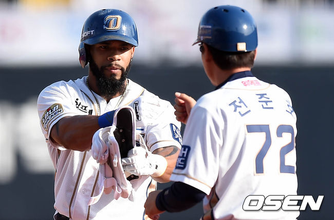 4회말 1사에서 NC 테임즈가 우전 2루타를 치고 전준호 코치와 하이파이브를 하고 있다.