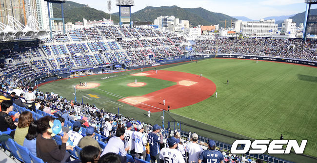 19일 오후 경남 창원 마산야구장에서 2014 한국야쿠르트 세븐 프로야구 포스트시즌 준플레이오프 NC 다이노스와 LG 트윈스의 경기, 경기장을 팬들이 가득 채우고 있다.